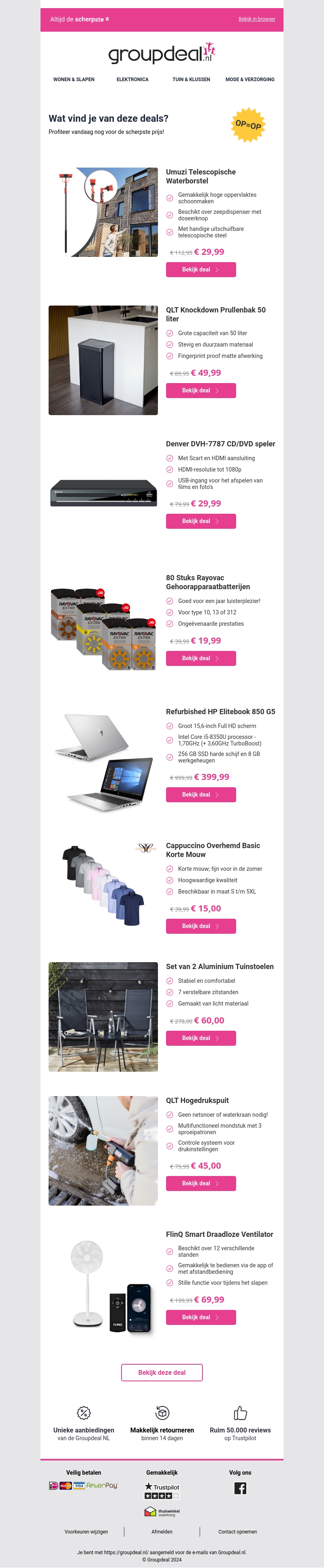 Bekijk deze fantastische aanbiedingen op een breed scala aan producten. Van telescopische waterborstels en slimme ventilatoren tot refurbished laptops en comfortabele tuinmeubelen, je vindt hier alles wat je nodig hebt tegen ongelooflijke prijzen. Profiteer snel, want op is op!