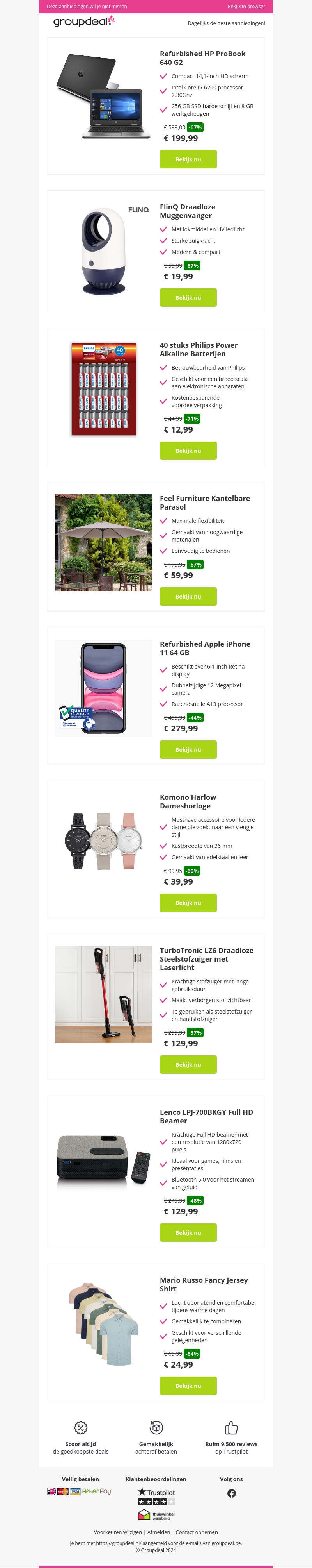 Bezoek Groupdeal voor de beste aanbiedingen op refurbished HP ProBook 640 G2, draadloze muggenvanger, parasols, iPhones, dameshorloges, stofzuigers en meer. Profiteer van hoge kortingen op topmerken en producten.