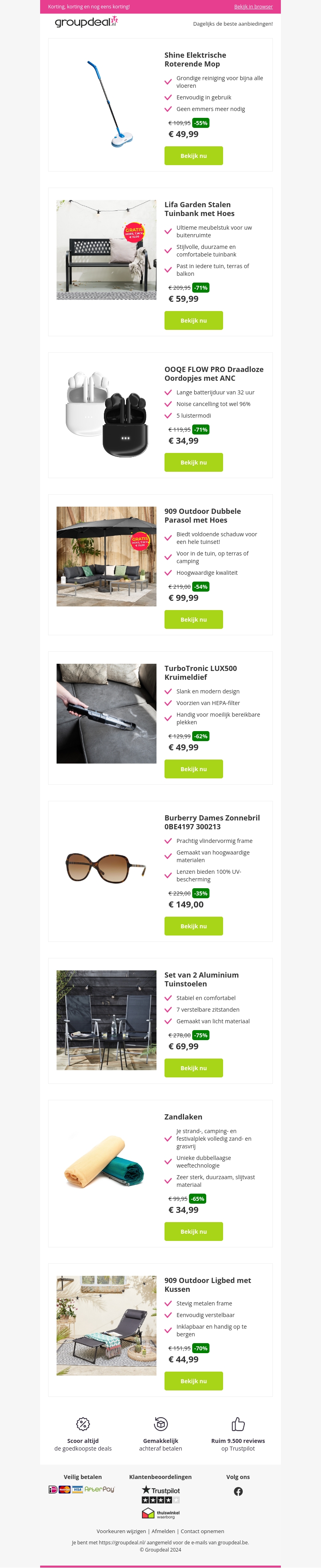 Ontdek de beste deals in onze nieuwste nieuwsbrief! Koop de Shine Elektrische Roterende Mop voor slechts €49,99, de stijlvolle Lifa Garden Stalen Tuinbank voor €59,99, en de OOQE FLOW PRO Draadloze Oordopjes met ANC voor slechts €34,99. Haast je, want op=op!