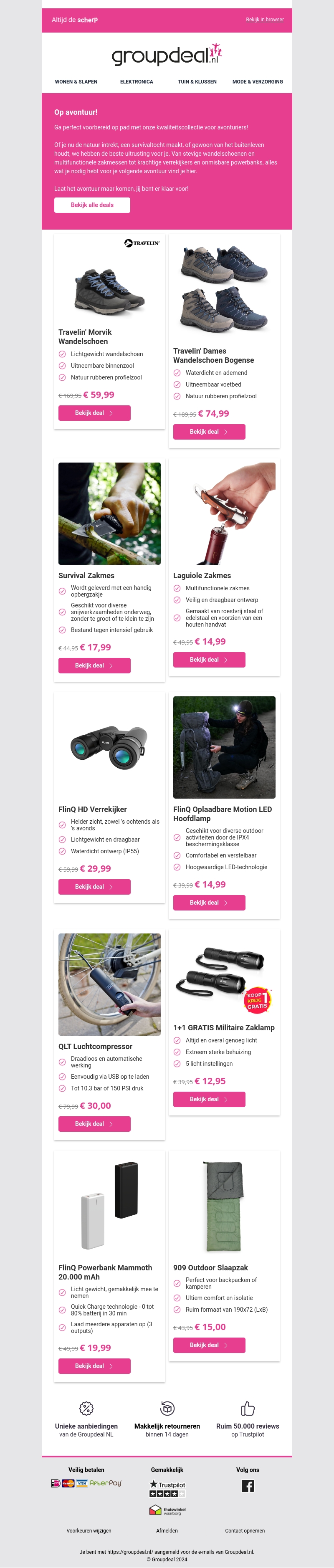 Ga goed voorbereid op pad met deze kwaliteit gear voor avontuurlijke trips van Groupdeal.nl. Ontdek een breed assortiment aan producten zoals wandelschoenen, veelzijdige zakmessen, krachtige zaklampen, handige luchtcompressors, compacte powerbanks en comfortabele slaapzakken. Klik hier om alle deals te bekijken en je voor te bereiden op je volgende avontuur.