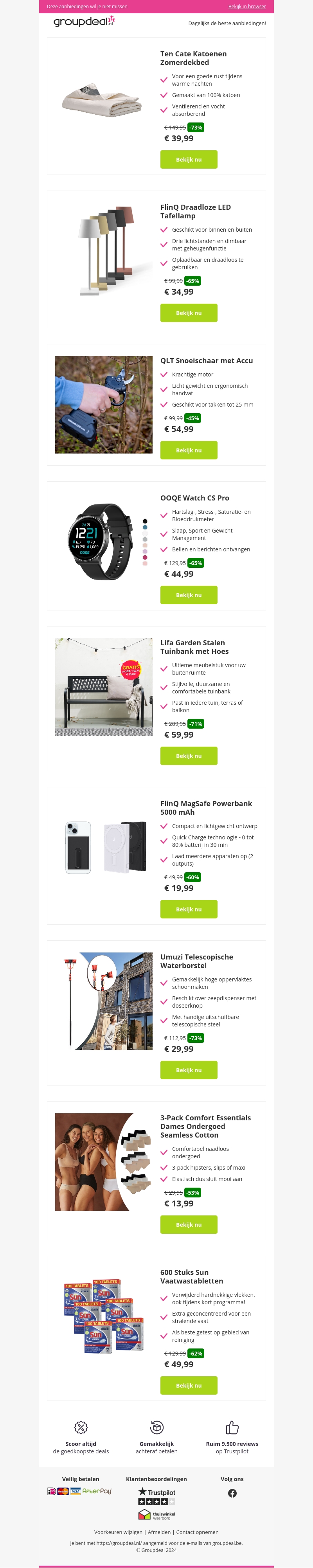 Bekijk onze geweldige aanbiedingen! Ontvang een Ten Cate Katoenen Zomerdekbed voor slechts €39,99. Ook beschikbaar: FlinQ Draadloze LED Tafellamp voor €34,99 en de QLT Snoeischaar met Accu voor €54,99. Verlies deze kans niet om kwalitatieve producten tegen gereduceerde prijzen te kopen.