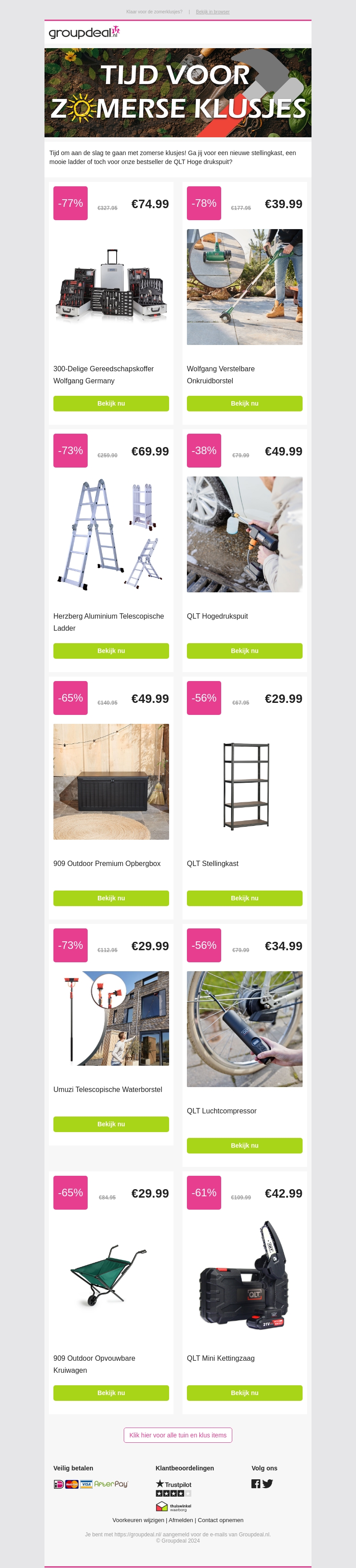 Het is tijd om aan de slag te gaan met zomerse klusjes! Of je nu een nieuwe stellingkast, een mooie ladder of onze bestseller de QLT hogedrukspuit nodig hebt, wij hebben geweldige aanbiedingen voor jou. Bekijk de beste kortingen op tools en accessoires om je zomerprojecten tot een succes te maken. Mis deze kansen niet!