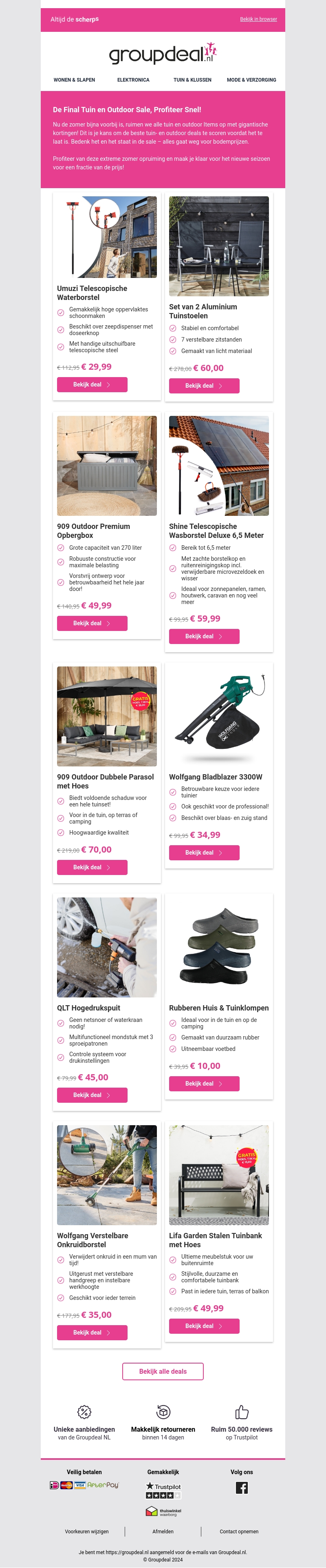 Mis de laatste kans niet om te profiteren van onze indrukwekkende Tuin & Outdoor opruiming! Met scherpe kortingen op diverse producten zoals telescopische waterborstels, aluminium tuinmeubelen, opbergboxen en meer. Alle deals zijn tijdelijk en op=op, dus wees er snel bij!