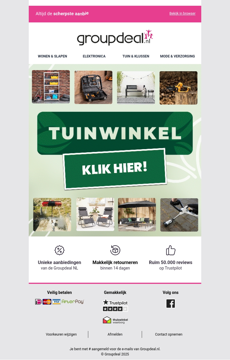 Ontdek de allerbeste tuindeals bij Groupdeal. Van tuingereedschap tot luxe tuinmeubelen, wij bieden alles wat je nodig hebt voor jouw perfecte tuin. Geniet van unieke aanbiedingen en scherpe prijzen voor een complete tuinervaring. Vergeet niet dat wij makkelijk retourneren aanbieden binnen 14 dagen. Bezoek onze website en ontdek wat Groupdeal voor jouw tuin kan betekenen!