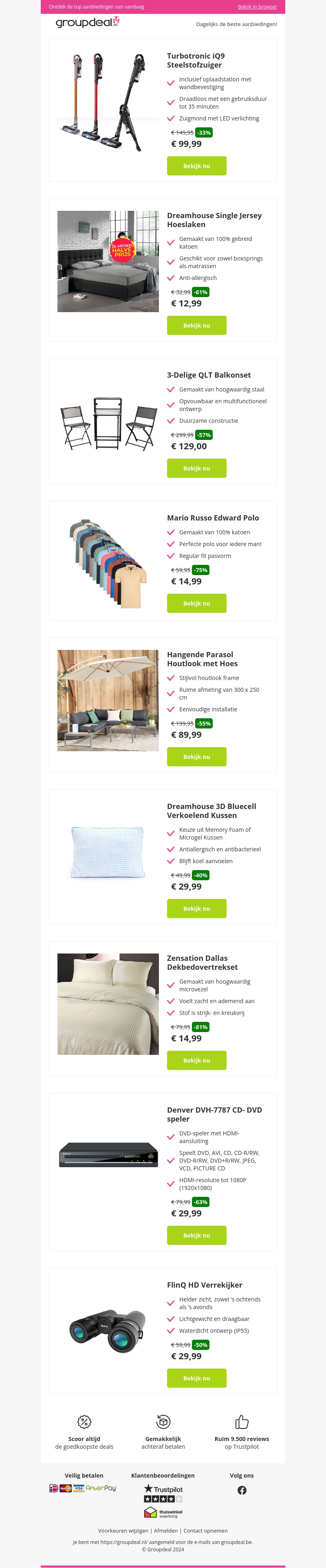 Profiteer van de beste deals bij mailaanbiedingen.nl. Scoor de Turbotronic iQ9 steelstofzuiger vanaf €99,99, Dreamhouse Single Jersey hoeslaken vanaf €12,99 en een 3-Delige QLT balkonset vanaf €129,00. Mis deze fantastische aanbiedingen niet!