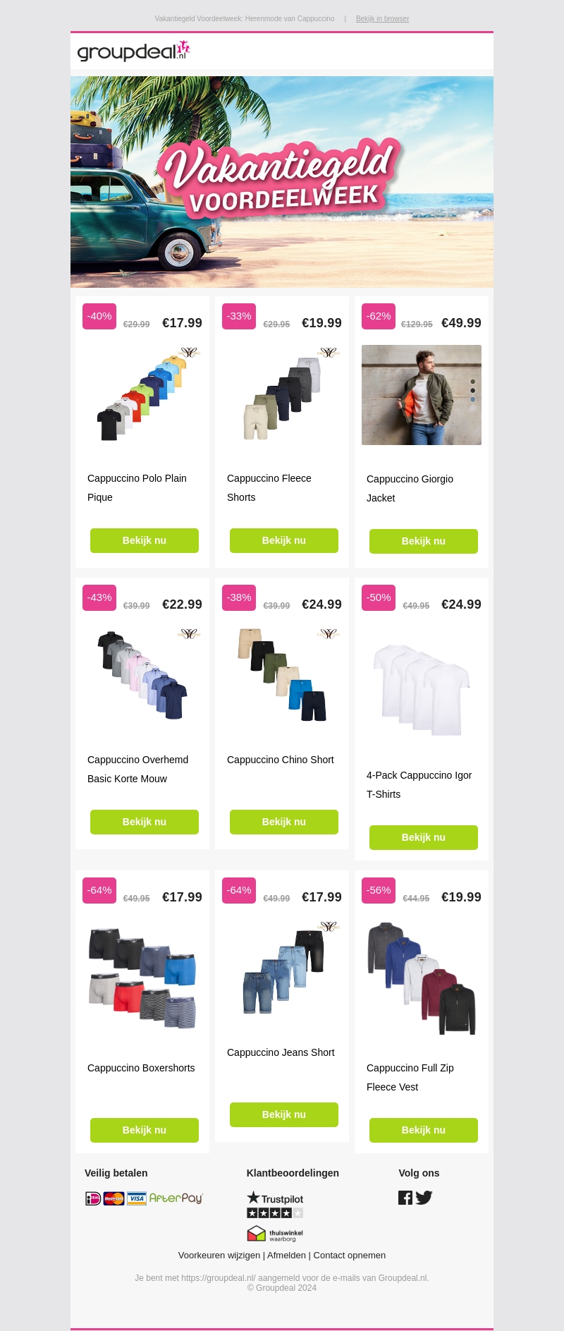 Mis deze geweldige kans niet om te besparen tijdens de Vakantiegeld Voordeelweek. Ontdek hoge kortingen op herenkleding van Cappuccino, waaronder polo's, jacks, shorts en meer. Alles met kortingen tot wel 64%. Winkel nu en verfris je garderobe voor een ongelooflijke prijs!