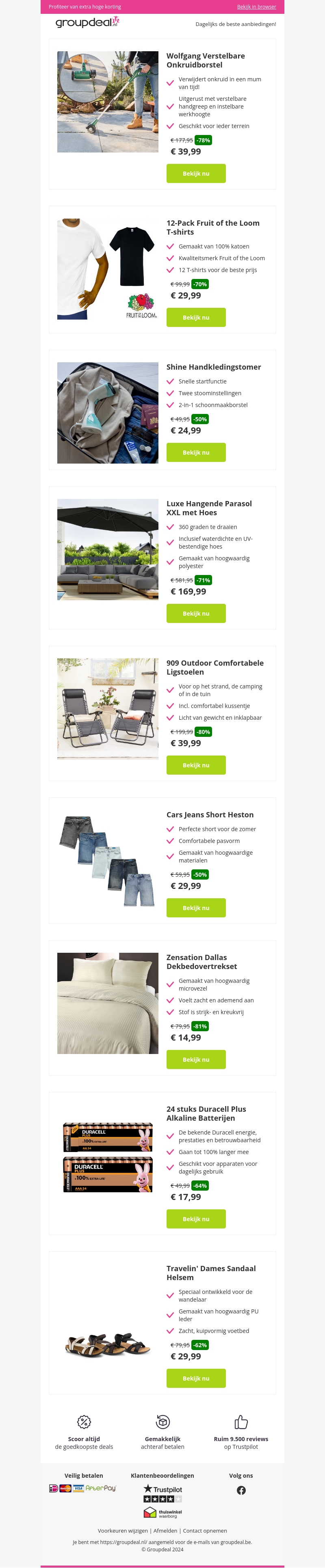 Ontdek de beste deals bij Groupdeal! Bespaar op de Wolfgang regelbare onkruidborstel, de 12-pack Fruit of the Loom T-shirts, en de Shine handkledingstomer. Deze kortingen zijn tijdelijk, bekijk ze nu en mis ze niet!