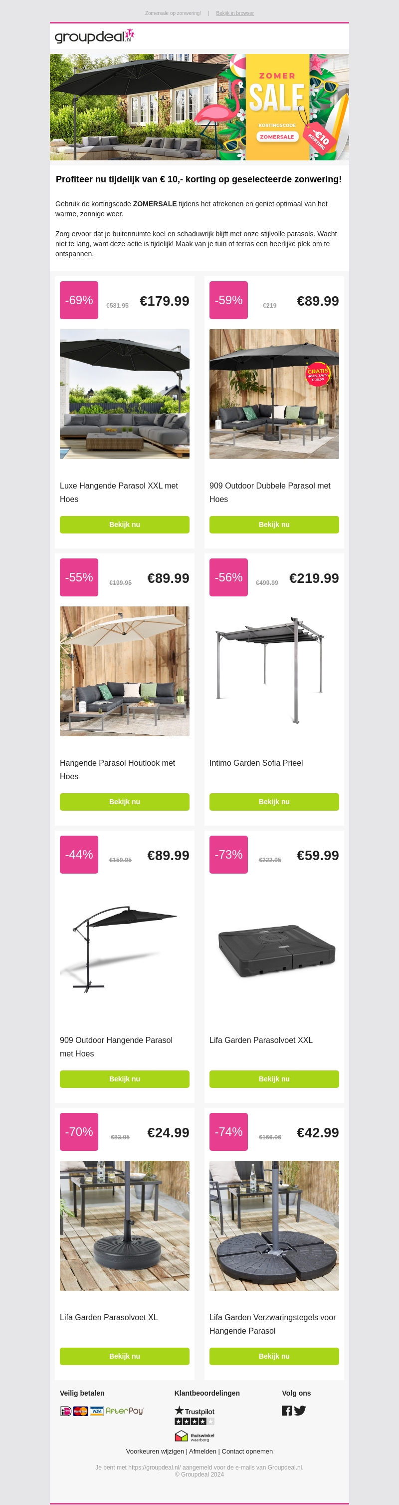 Profiteer nu tijdelijk van €10 korting op geselecteerde zonwering! Gebruik de kortingscode ZOMERSALE bij het afrekenen en geniet optimaal van het warme, zonnige weer. Zorg ervoor dat je buitenruimte koel en schaduwrijk blijft met onze stijlvolle parasols. Deze actie is tijdelijk, dus wacht niet te lang!
