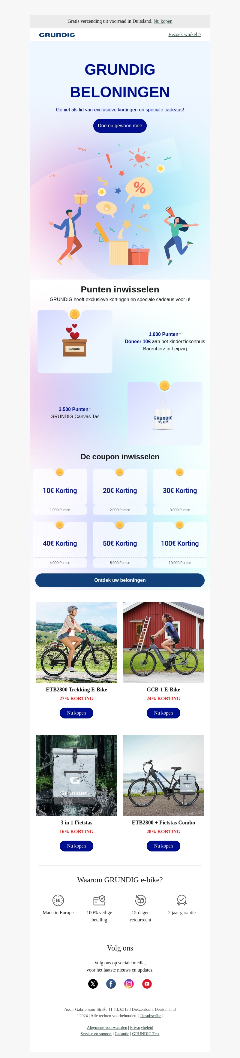 GRUNDIG introduceert zijn nieuwe beloningssysteem! Leden kunnen genieten van unieke kortingen op e-bikes en accessoires. Wissel punten in voor kortingsbonnen tot 100€ en speciale geschenken. Profiteer van hoge kortingen op geselecteerde producten. Ontdek de voordelen van GRUNDIG e-bikes en blijf verbonden via sociale media.