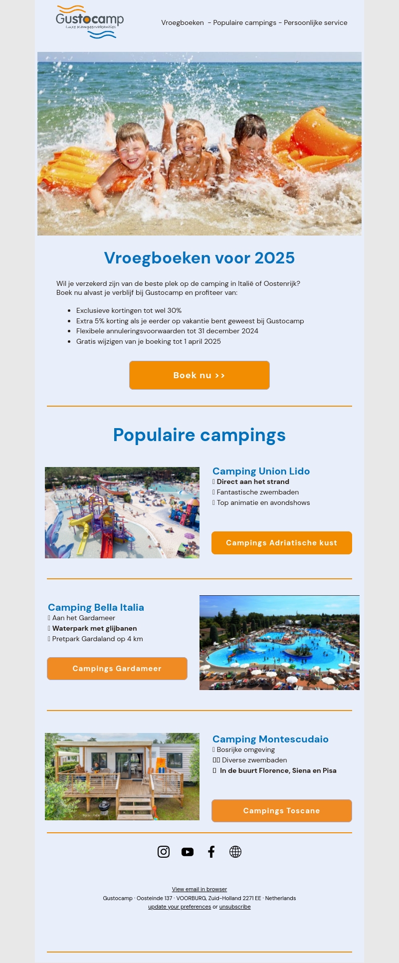 Wil je verzekerd zijn van de beste plek op de camping in ItaliΓ« of Oostenrijk? Boek nu alvast je verblijf bij Gustocamp en profiteer van exclusieve kortingen tot wel 30%, extra 5% korting als je eerder op vakantie bent geweest bij Gustocamp, flexibele annuleringsvoorwaarden tot 31 december 2024 en gratis wijzigen van je boeking tot 1 april 2025.