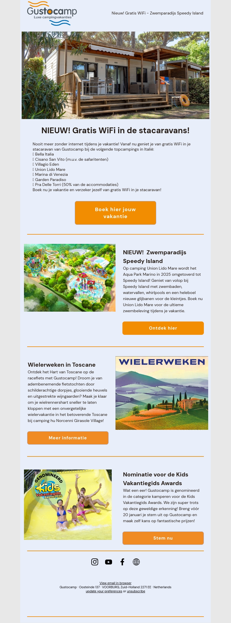 Gustocamp biedt nu gratis WiFi in geselecteerde stacaravans in ItaliΓ«. Bezoek het nieuwe Speedy Island waterpark voor volop zwemplezier. Verken de Toscaanse heuvels tijdens speciale wielerweken en stem op Gustocamp voor de Kids Vakantiegids Awards. Mis de kans niet om fantastische prijzen te winnen!