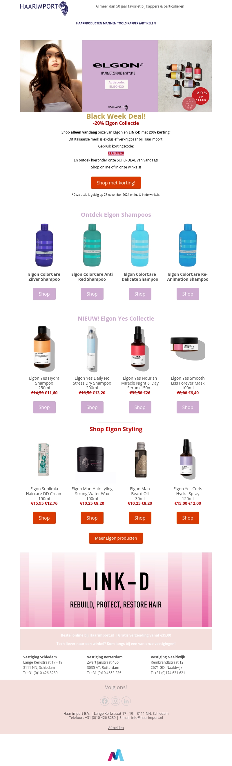 Profiteer van 20% korting op de Elgon collectie tijdens Haarimport's Black Week. Deze exclusieve aanbieding geldt slechts vandaag. Gebruik de kortingscode ELGON20 om te besparen op top haarverzorgingsproducten. Shop online of in onze winkels en ontdek het complete assortiment shampoos, serums en stylingproducten.