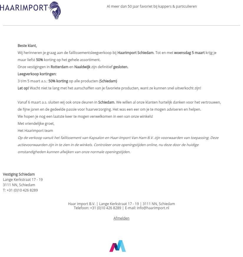 Mis de grote faillissementsleegverkoop niet bij Haarimport Schiedam met kortingen tot 50% op het gehele assortiment. Bezoek ons voor woensdag 5 maart en profiteer van geweldige deals. Let op: onze vestigingen in Rotterdam en Naaldwijk zijn al gesloten.