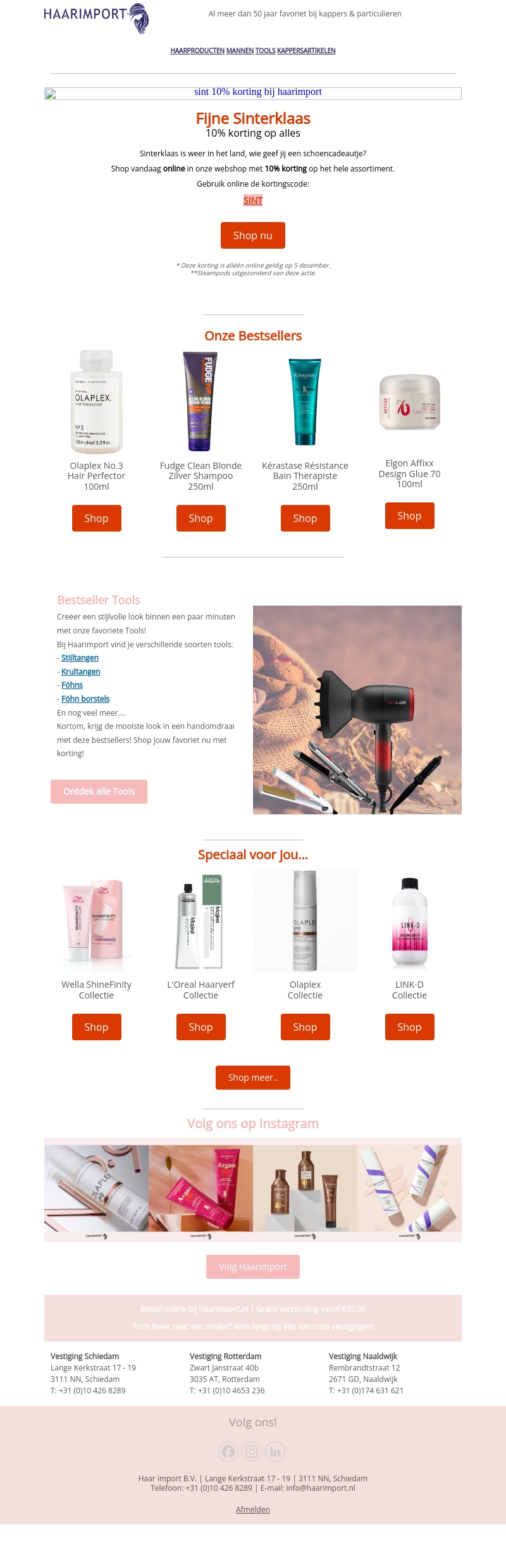 Vier Sinterklaas met onze exclusieve korting van 10% op het gehele assortiment bij Haarimport. Ontdek onze bestsellers zoals Olaplex Hair Perfector en Kérastase Résistance. Gebruik de code SINT voor uw korting. Actie geldig tot 5 december.