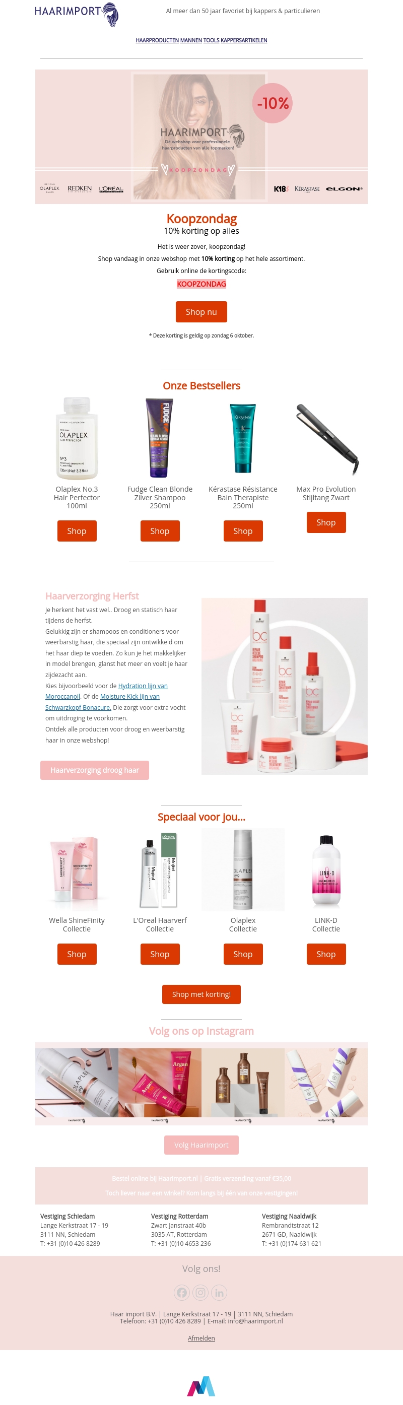Het is weer koopzondag bij Haarimport! Geniet van 10% korting op het gehele assortiment in onze webshop. Of je nu op zoek bent naar haarverzorging, stylingtools of haarverf, je vindt het allemaal bij ons. Mis deze kans niet om je favoriete producten voordelig in huis te halen. Gebruik de kortingscode KOOPZONDAG en maak gebruik van de aanbieding. Wees snel, want de actie geldt alleen zondag 6 oktober.