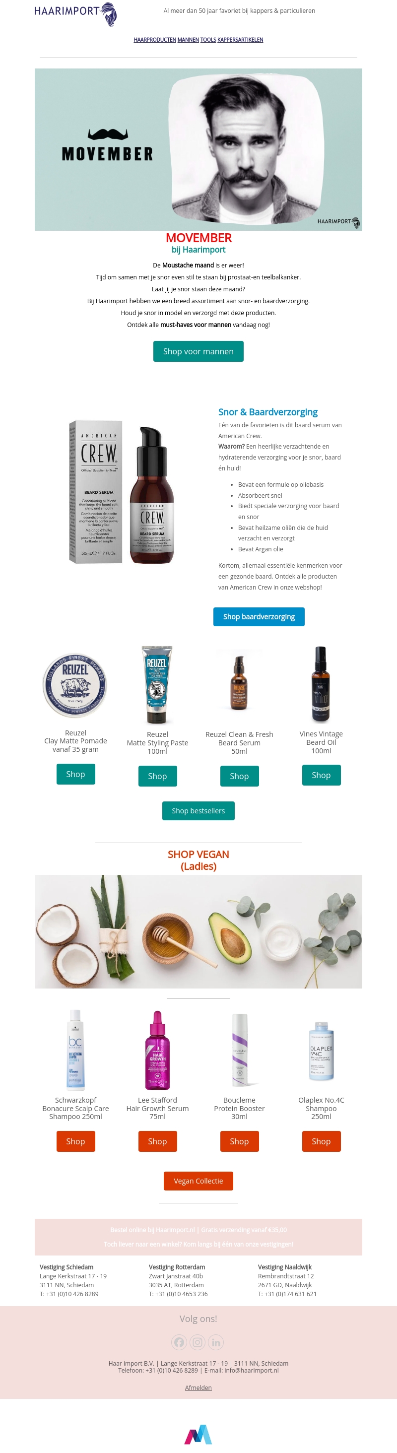 Movember is terug, en Haarimport heeft alles wat je nodig hebt om je snor en baard in topvorm te houden. Van voedende oliën tot hydraterende serums voor een gezonde verzorging. Of je nu op zoek bent naar snor- en baardverzorging of vegan haarproducten voor dames, we hebben iets voor iedereen. Shop nu onze bestsellers en ontdek de must-haves van dit seizoen.