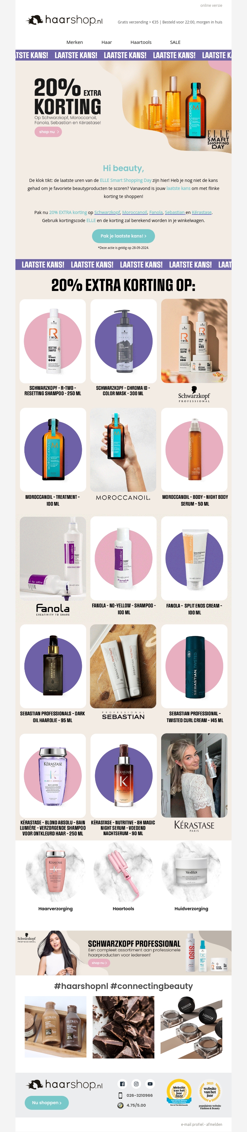 Mis deze kans niet! Ontvang nu 20% EXTRA korting op alle producten van Schwarzkopf, Moroccanoil, Fanola, Sebastian & Kérastase bij Haarshop.nl. Deze aanbieding is slechts beperkt geldig en geldt op een breed assortiment aan haarverzorgingsproducten. Shop nu en zorg dat je haar straalt als nooit tevoren!