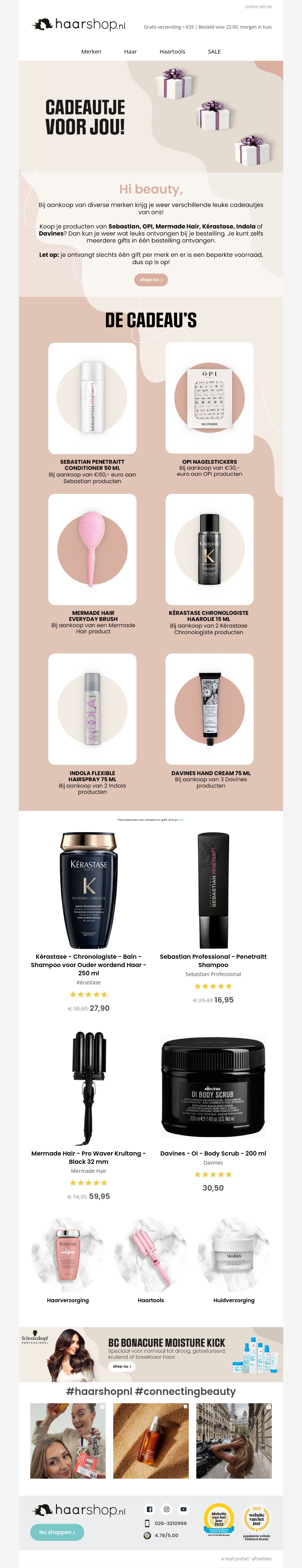 Bij Haarshop.nl krijg je nu bij aankoop van producten van topmerken als Sebastian, OPI, Mermade Hair, Kérastase en meer, exclusieve cadeaus. Dit is jouw kans om jezelf te verwennen met enkele van de beste haar- en lichaamsproducten. Bekijk de voorwaarden en bestel vandaag nog!