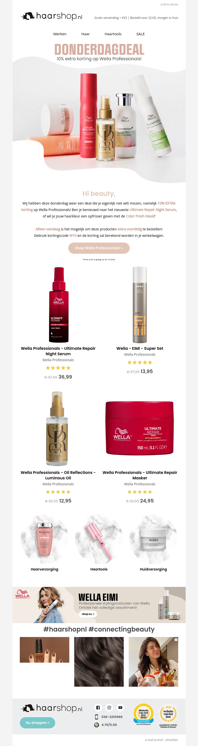 Deze donderdag biedt Haarshop.nl een onweerstaanbare deal met 10% extra korting op Wella Professionals. Mis de kans niet om producten zoals de Ultimate Repair Night Serum uit te proberen. Haal het beste uit je haarverzorging met onze speciale korting. Alleen vandaag beschikbaar, dus wees er snel bij!