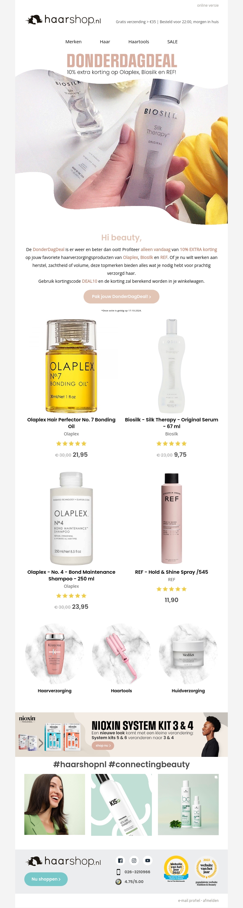 Deze DonderDagDeal biedt een exclusieve 10% extra korting op top haarverzorgingsproducten van Olaplex, Biosilk, en REF. Alleen vandaag geldig, is dit de perfecte kans om je favoriete producten tegen een scherpe prijs in te slaan. Gebruik de kortingscode DEAL10 om te profiteren van deze aanbieding. Haast je om te profiteren van deze geweldige deal!
