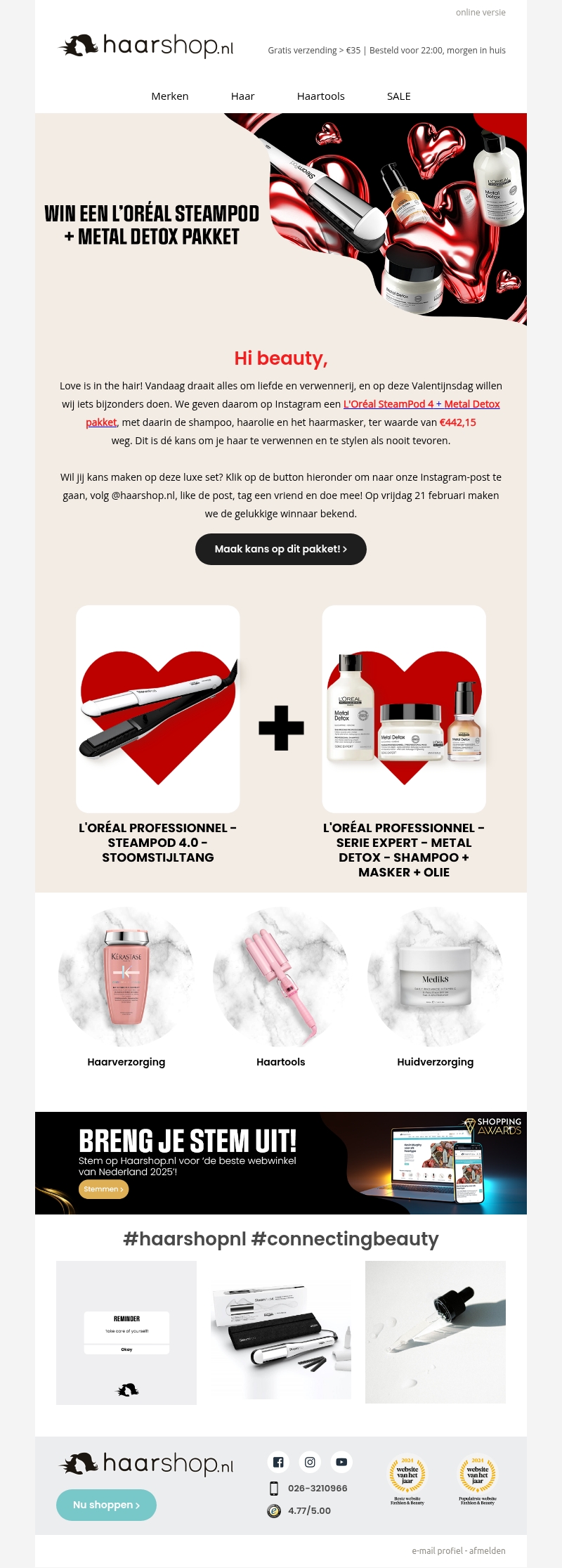 Vier Valentijnsdag met ons speciale giveaway! Maak kans op een L'Oréal SteamPod 4 + Metal Detox pakket, inclusief shampoo, haarolie en maskers. Een waardevolle verrassingsset voor ultieme haarverzorging, perfect om je haar te verwennen en stylen als nooit tevoren. Doe mee en maak kans voor 21 februari.