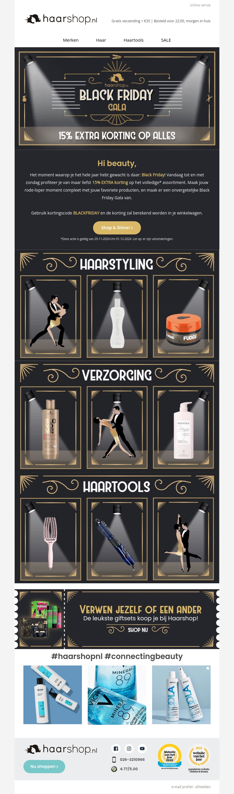 Beleef de ultieme Black Friday Gala bij Haarshop met 15% extra korting op het volledige assortiment. Geniet van geweldige kortingen op je favoriete haarproducten en verwen jezelf of een ander met de perfecte giftsets. Mis deze unieke kans niet en maak je Black Friday onvergetelijk!