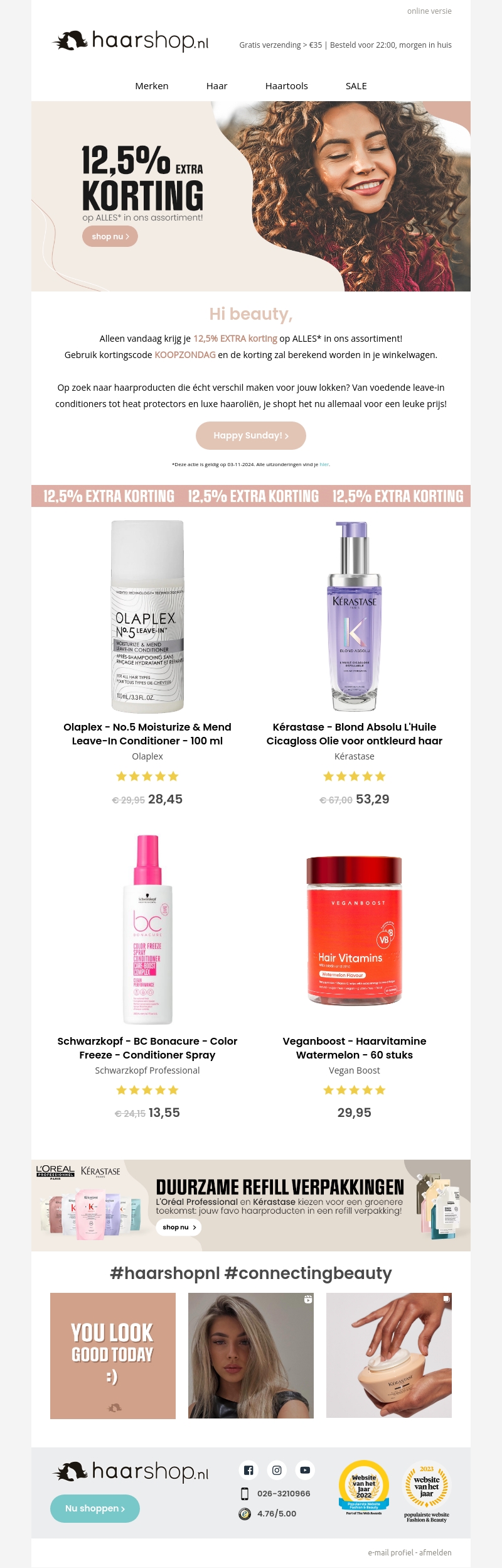 Het is zondag en dat betekent extra voordeel bij Haarshop.nl. Ontvang vandaag 12,5% extra korting op ons gehele assortiment met de code KOOPZONDAG. Verwen jezelf met luxe producten van merken zoals Olaplex en Kรฉrastase. Voor 22:00 besteld, morgen in huis!
