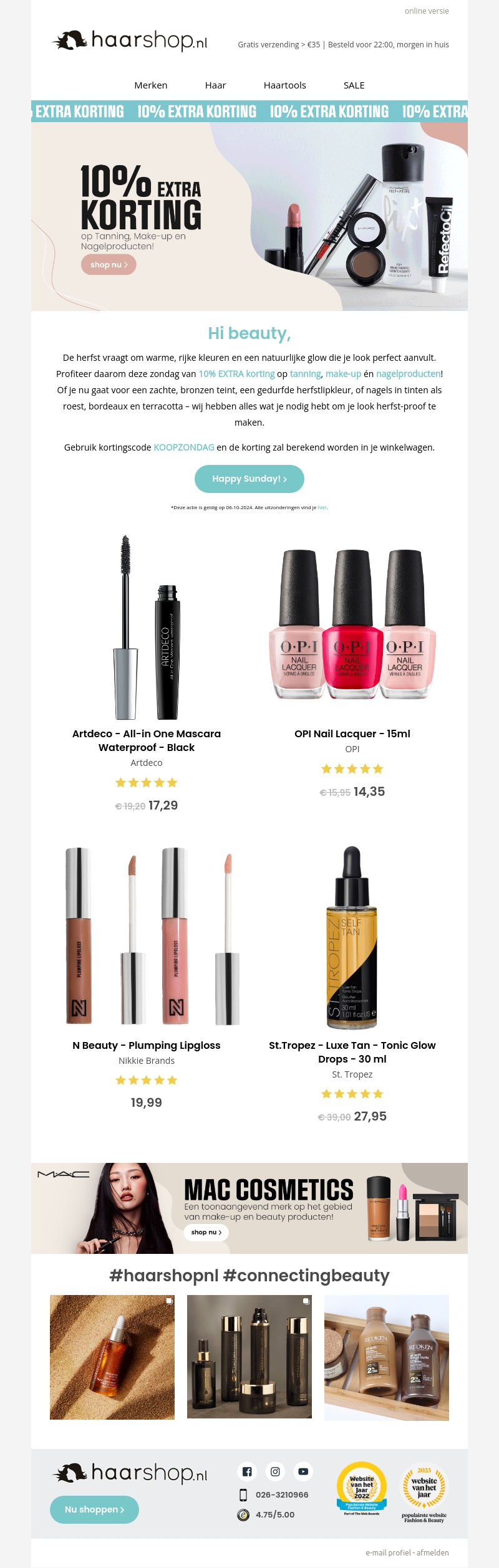 Deze zondag kun je profiteren van 10% extra korting op allerlei beautyproducten, waaronder make-up en tanning. Verwen jezelf met prachtige producten van merken als Artdeco, OPI en St. Tropez, ideaal om je look herfst-proof te maken. Haal de warme tinten van de herfst in huis met onze exclusieve aanbiedingen. Vergeet niet de kortingscode KOOPZONDAG te gebruiken voor extra voordeel!