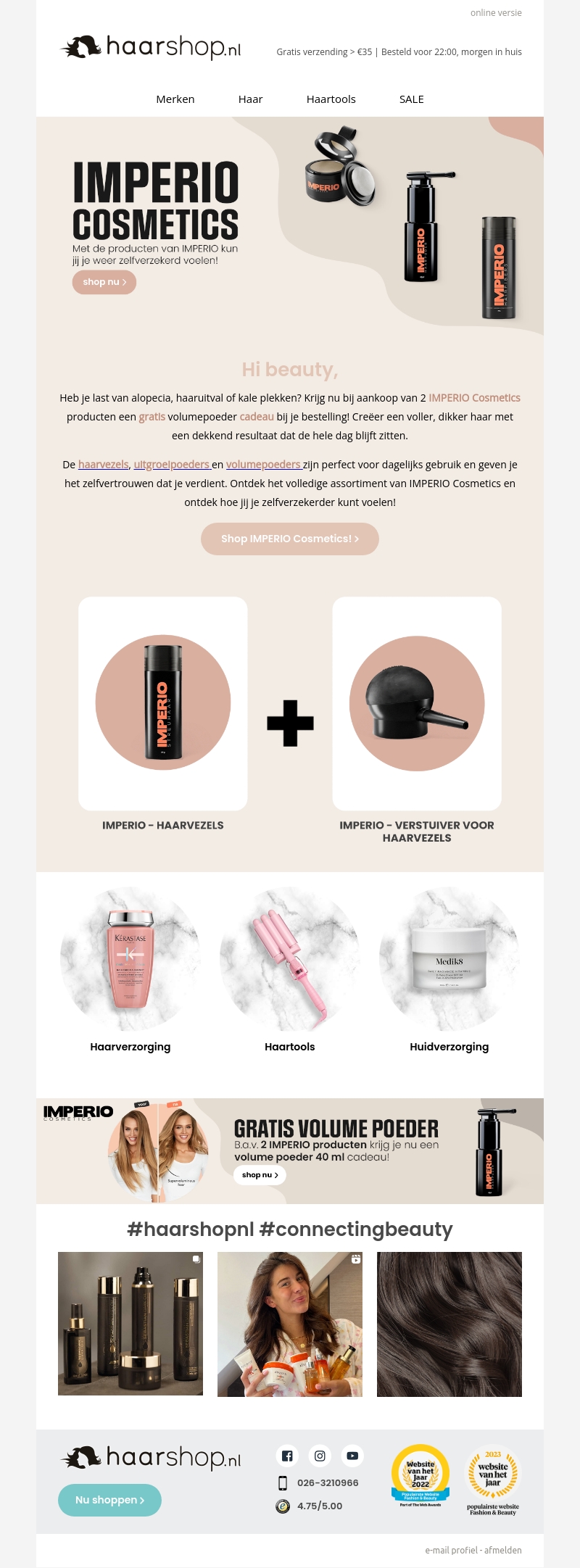 Ervaar de kracht van Imperio Cosmetics en krijg nu een gratis volumepoeder bij aankoop. Perfect voor dagelijks gebruik, onze haarvezels en volumepoeders geven je het zelfvertrouwen dat je verdient. Creรซer een voller en dikker effect dat de hele dag blijft zitten. Ontdek het volledige assortiment en voel je zelfverzekerd!