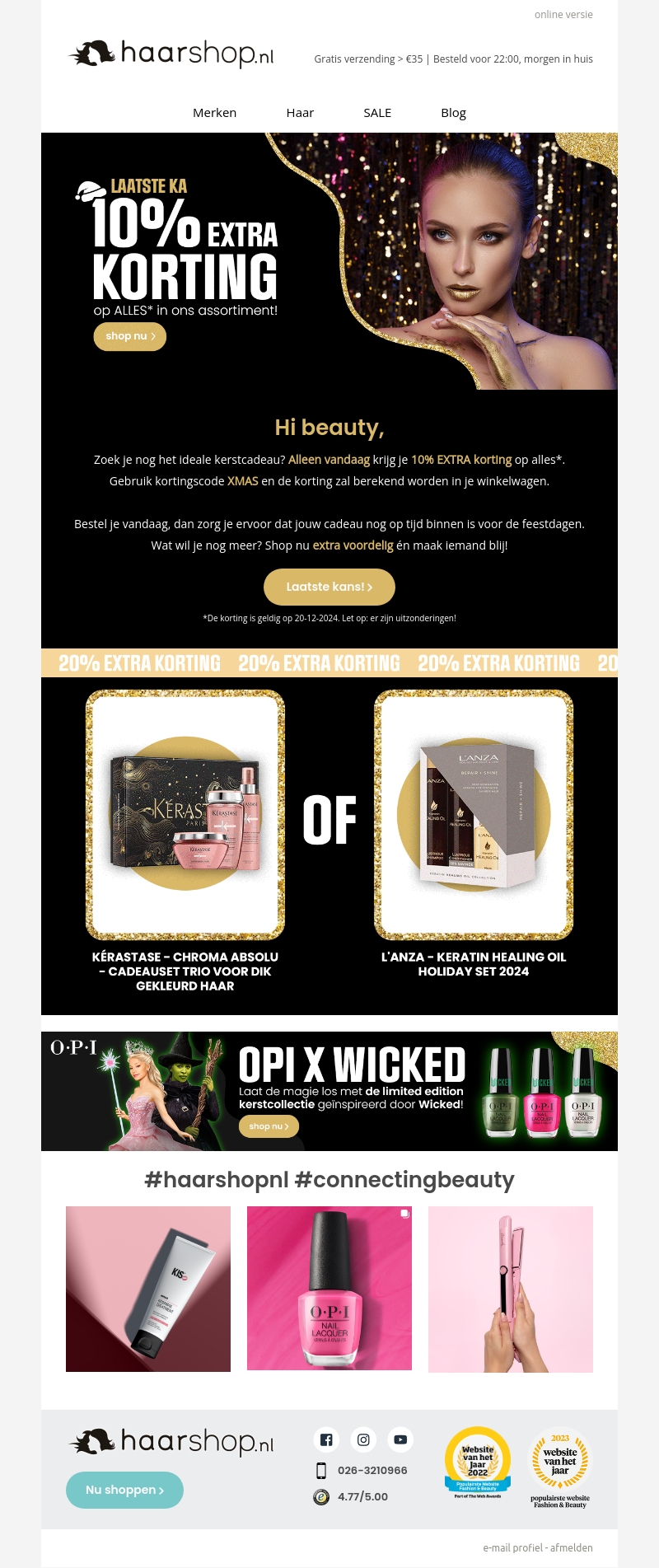 Grijp je kans op de ultieme kerstcadeaus met 10% extra korting op alles bij Haarshop.nl! Gebruik de kortingscode XMAS in je winkelwagen. Deze aanbieding is alleen geldig voor vandaag, dus wacht niet langer. Haast je en zorg dat je geschenken op tijd zijn voor de feestdagen!