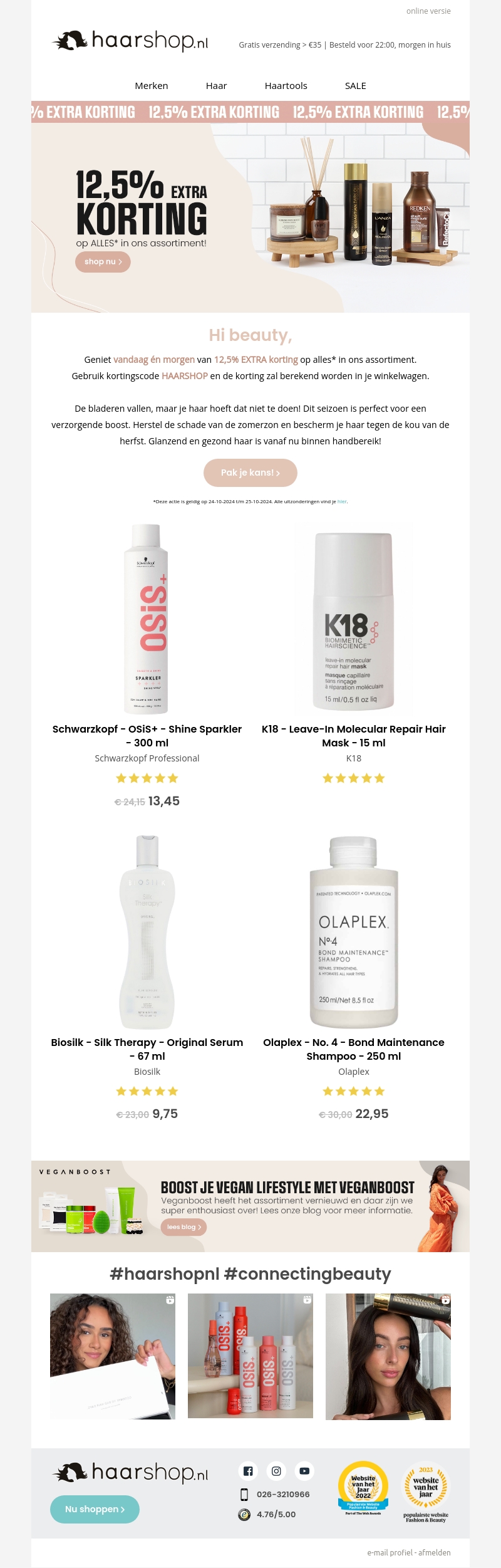 Dit seizoen biedt Haarshop.nl een exclusieve korting van 12,5% op hun gehele assortiment. Geniet van producten van topmerken zoals Schwarzkopf, K18, Biosilk en Olaplex. Ideaal om je haarverzorging naar een hoger niveau te tillen terwijl je bespaart. Mis deze kans niet om je haar herfstklaar te maken met glanzende en gezonde resultaten. Gebruik de kortingscode HAARSHOP bij het afrekenen.