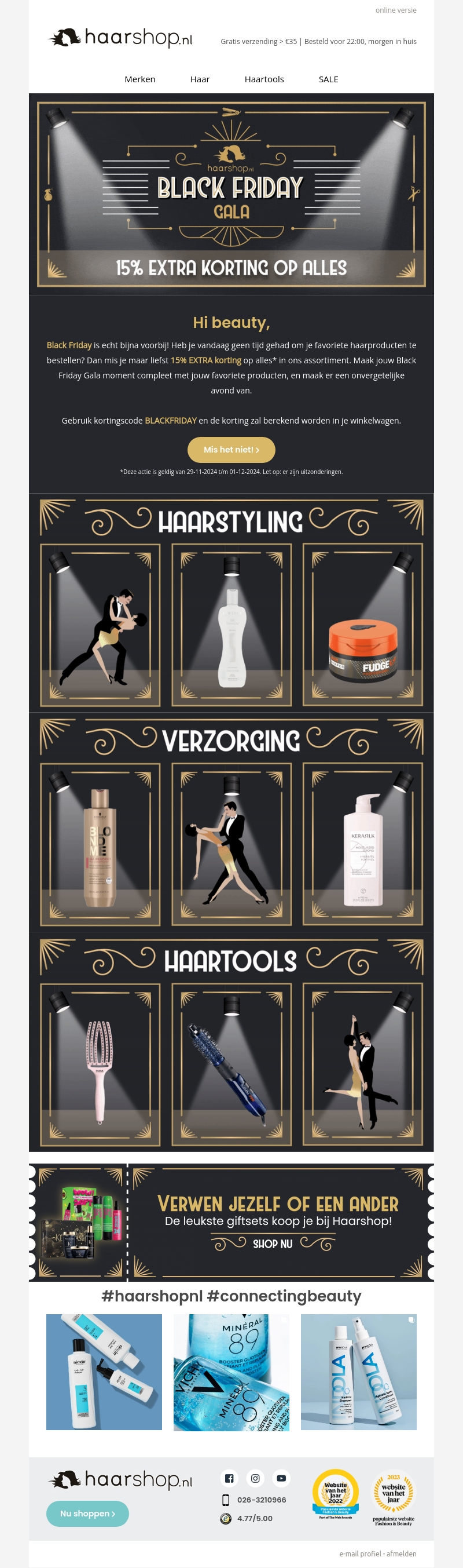 Black Friday is gearriveerd bij Haarshop.nl met een ongelofelijke 15% extra korting op het hele assortiment. Van haarstyling tot verzorging en haartools, alles is in de aanbieding. Gebruik de kortingscode BLACKFRIDAY om te profiteren van deze actie. Mis deze kans niet om jezelf of een ander te verwennen met de leukste giftsets.