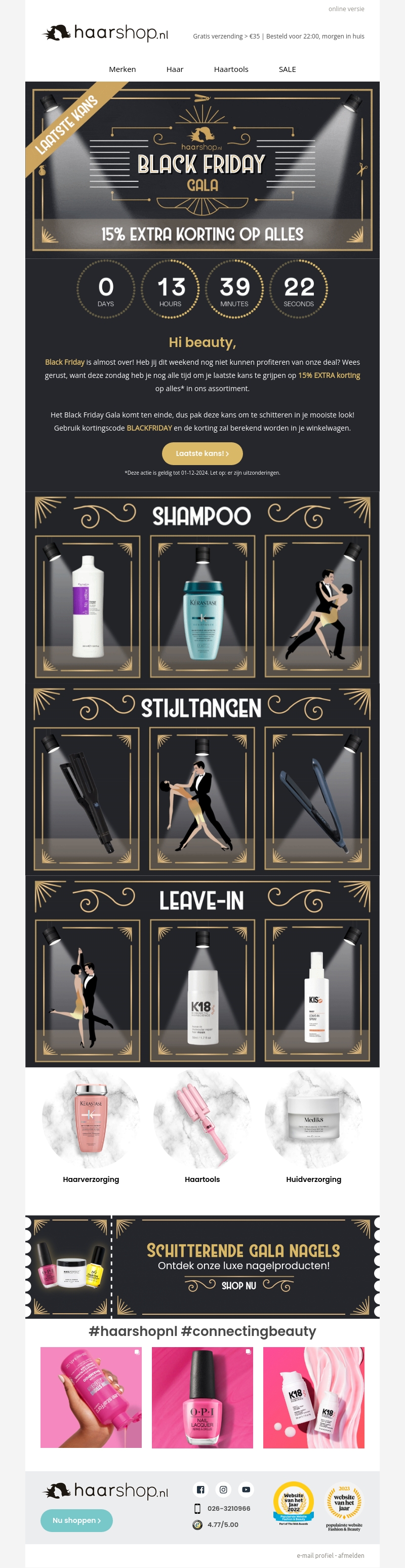 Het Black Friday Gala van Haarshop.nl loopt bijna ten einde. Profiteer van 15% extra korting op het volledige assortiment. Gebruik de kortingscode BLACKFRIDAY om van deze aanbiedingen te genieten. Ontdek geweldige deals op shampoo, stijltangen en meer. De actie is geldig tot 1 december 2024.