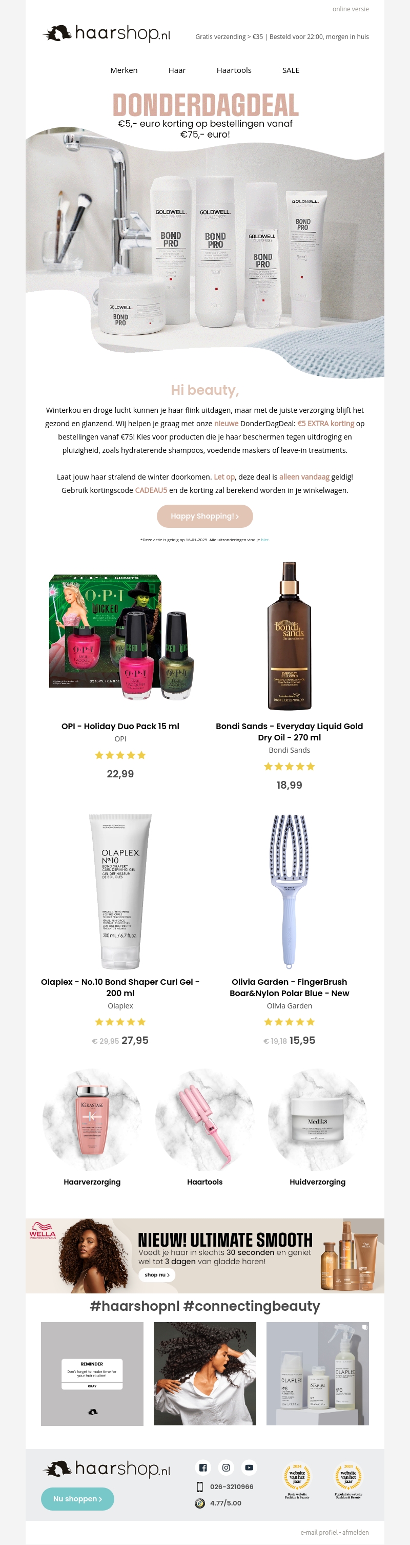 Winterkou kan je haar uitdrogen, maar met de juiste verzorging blijft het gezond en glanzend. Profiteer van de nieuwe DonderDagDeal: krijg €5 extra korting op bestellingen van €75 of meer. Deze aanbieding is alleen vandaag geldig. Gebruik de kortingscode CADEAU5 bij het afrekenen. Bekijk onze selectie producten die helpen bij het beschermen van je haar tegen invloeden van buitenaf.