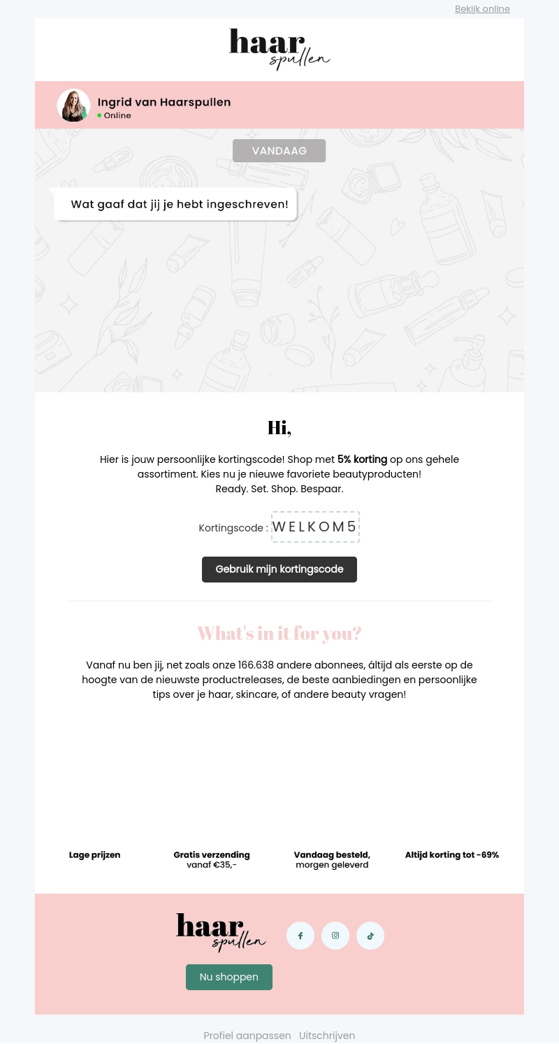 Hi, profiteer nu van je persoonlijke kortingscode en ontvang 5% korting op ons gehele assortiment. Kies jouw nieuwe favoriete beautyproducten. Veel shopplezier en bespaar met korting!