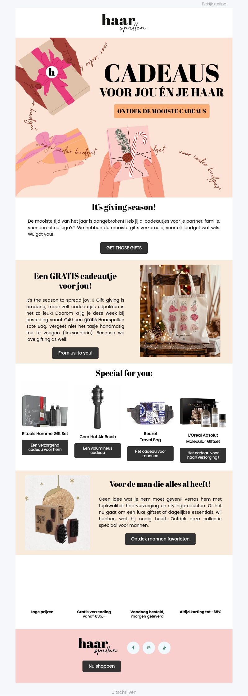 Geef een speciaal cadeau dit seizoen met onze schitterende opties. Van verzorgingssets tot volumizers, wij hebben het allemaal! Ontvang een gratis Haarspullen Tote Bag bij besteding vanaf €40. Zorg ervoor dat je deze kerst de perfecte verrassing in huis haalt.