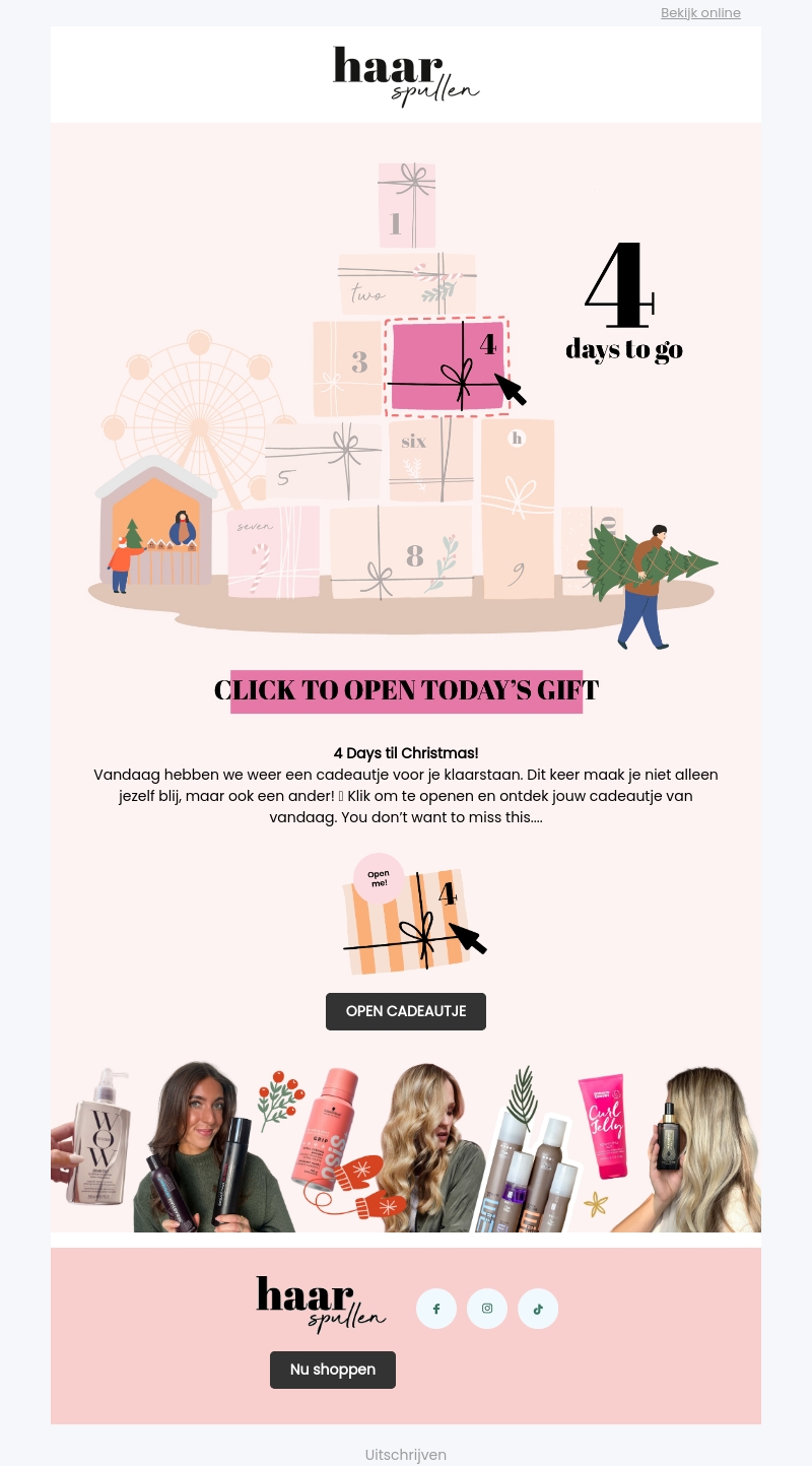 Vier dagen tot kerst! Elke dag hebben we een speciaal cadeautje voor je klaarstaan dat zowel jou als een ander blij maakt. Klik om jouw cadeau te openen en ontdek wat er vandaag op je wacht. Mis deze kans niet om iets bijzonders te ontvangen!