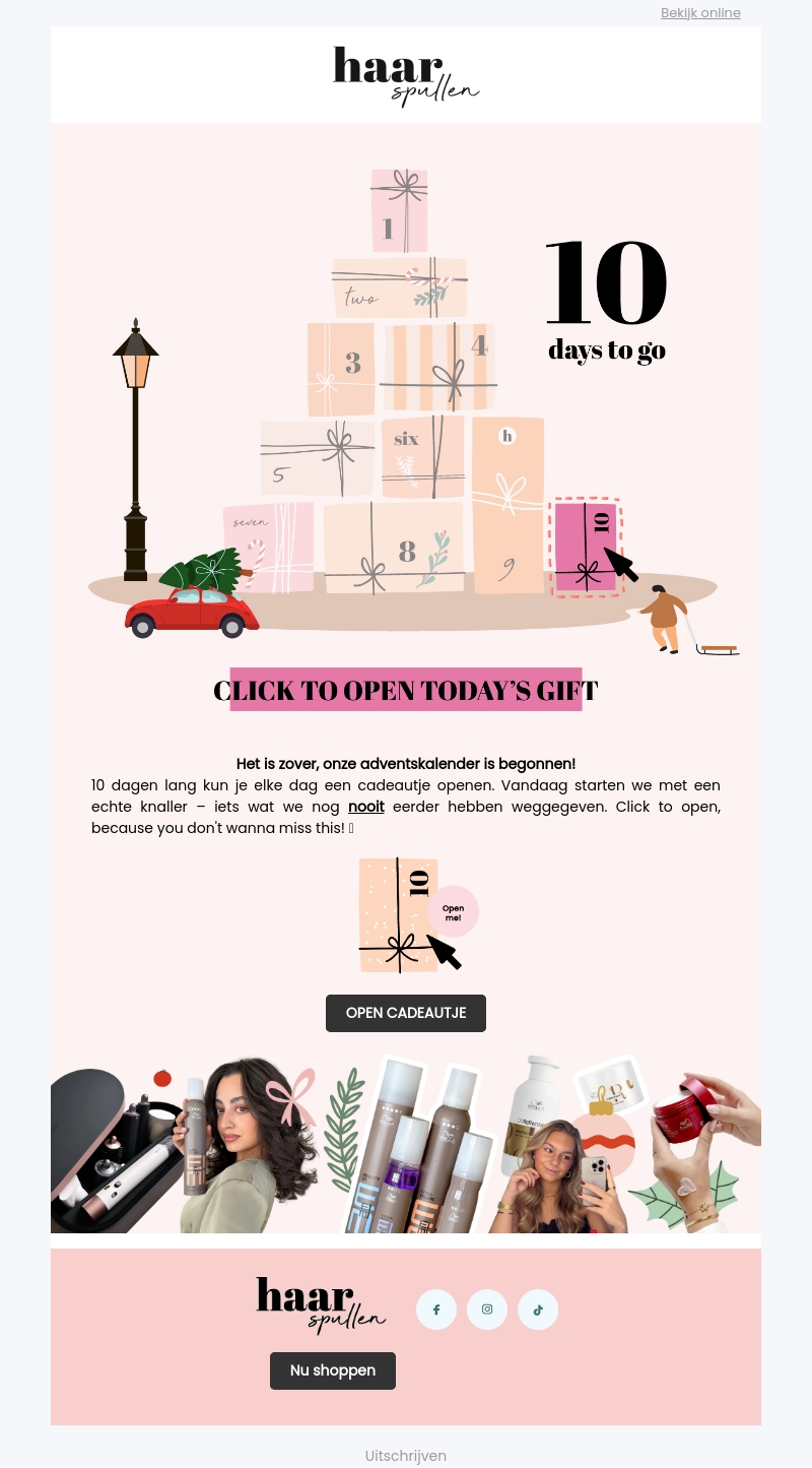 De adventskalender van Haarspullen is gestart. Elke dag kun je een nieuw cadeau openen, beginnend met een spectaculaire verrassing. Mis het niet en klik om te ontdekken wat er vandaag achter de deur schuilgaat. Perfect voor liefhebbers van verrassingen en cadeautjes.