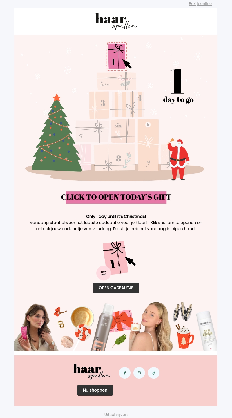 Het is bijna Kerstmis en Haar Spullen heeft een laatste cadeautje voor jou. Klik snel om het te openen en ontdek jouw verrassing van vandaag. Wacht niet langer, want deze kans komt maar één keer per jaar. Psst... je hebt het vandaag in eigen hand! Geniet van de feestelijke sfeer en heerlijke producten om jezelf te verwennen.