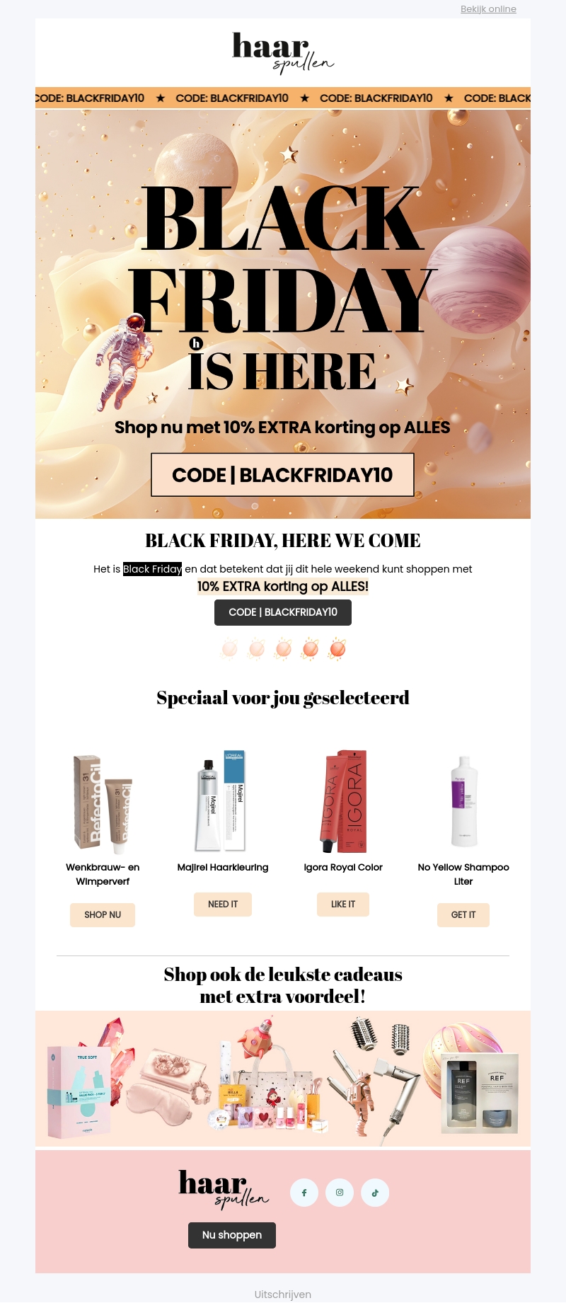 Het is Black Friday en dat betekent geweldige kortingen bij Haarspullen! Geniet van 10% extra korting op al je favoriete producten. Bezoek nu onze website en pak je voordeel met de code BLACKFRIDAY10. Mis deze kans niet om jezelf te verwennen of cadeaus in te slaan. Actie geldt het hele weekend.