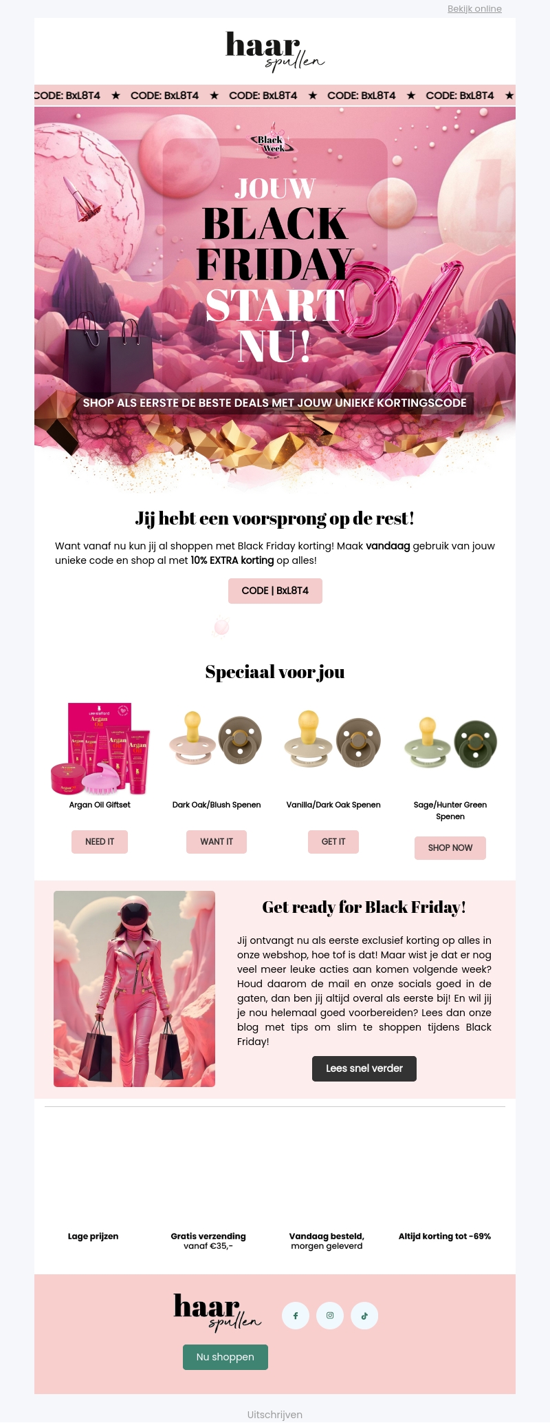 Jouw Black Friday begint nu bij Haarspullen met exclusieve deals en kortingen. Gebruik de unieke kortingscode BxL8T4 om 10% extra korting te krijgen op alles. Mis deze kans niet om als eerste te profiteren van de beste aanbiedingen. Wees voorbereid op nog meer acties in de komende week.