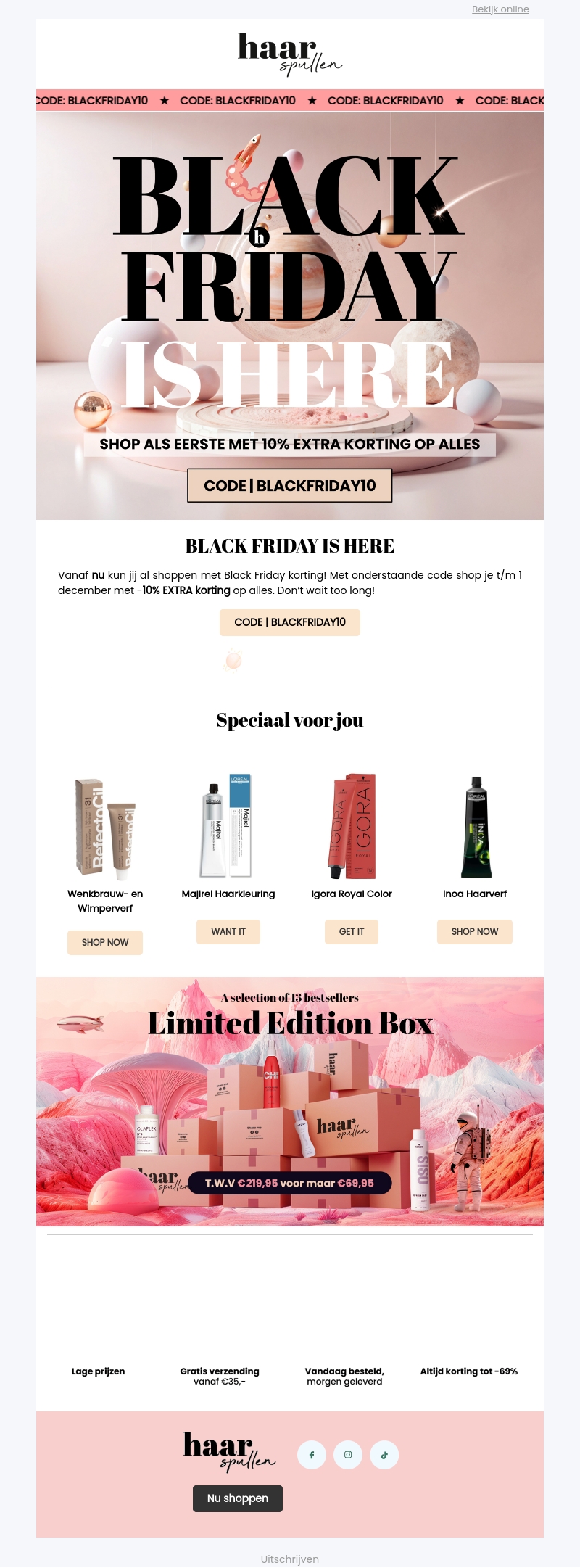 Ontketen je shopplezier tijdens de Black Friday uitverkoop met 10% extra korting. Gebruik de code BLACKFRIDAY10 en ontdek onze speciale selectie haarverzorgingsproducten. Profiteer van gratis verzending en snelle levering. Mis deze kans niet om je favoriete beautymerken in huis te halen.