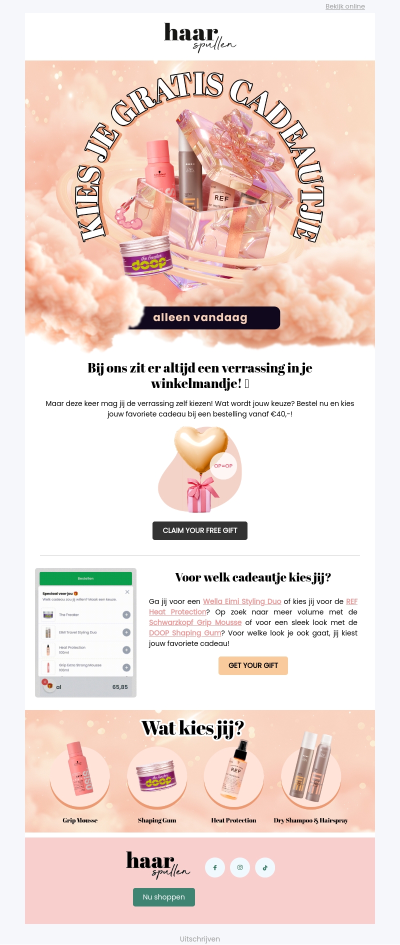 Altijd al je eigen verrassing willen kiezen? Bij Haarspullen kan het! Bestel nu en kies je favoriete gratis cadeau bij een bestelling van €40 of meer. Van Wella Eimi Styling Duo tot Schwarzkopf Grip Mousse, de keuze is aan jou. Maar wees snel, op is op!