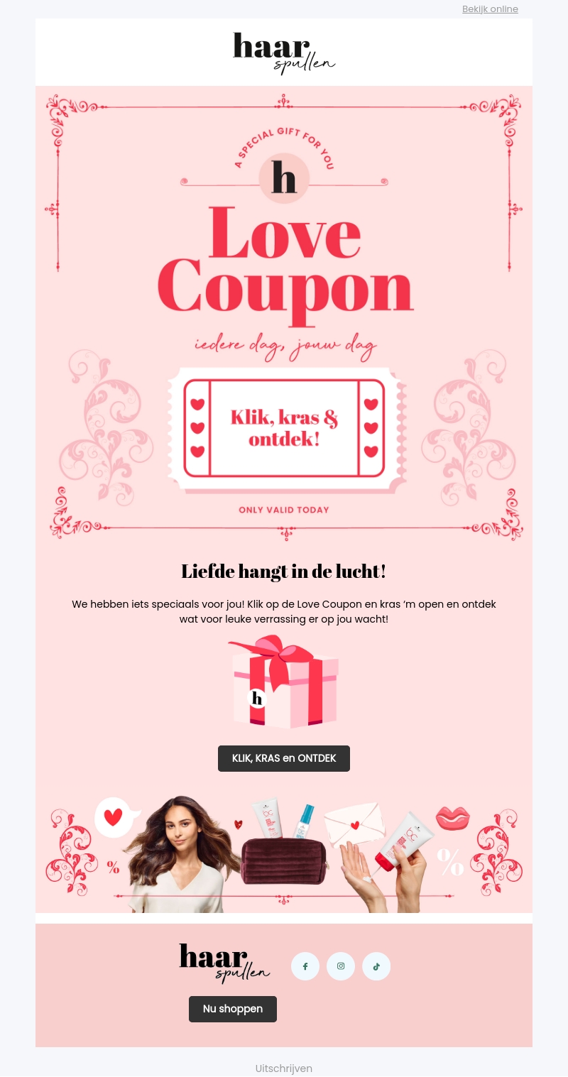 Ervaar de liefde bij Haarspullen met onze speciale Love Coupon! Klik, kras en ontdek onweerstaanbare verrassingen die jouw dag extra bijzonder maken. Laat deze unieke kans niet liggen en verrijk je routine met liefdevolle aanbiedingen.