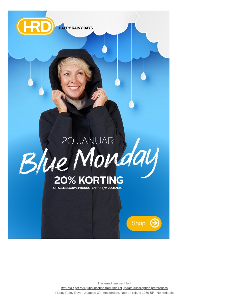Op Blue Monday biedt HappyRainyDays een speciale korting van 20% op alle blauwe producten. Deze actie geldt van 18 t/m 20 januari. Sla je slag en voeg kleur toe aan je regenachtige dagen met de stijlvolle collectie van HappyRainyDays.