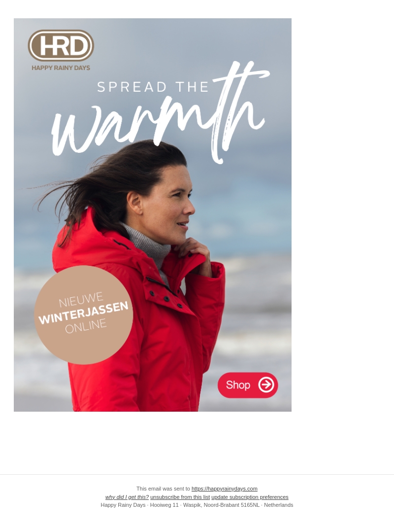 Happy Rainy Days introduceert hun nieuwste collectie winterjassen om je stijlvol en warm te houden. Ontdek modieuze ontwerpen die bestand zijn tegen alle weersomstandigheden. Perfect voor de koudere maanden, biedt deze collectie comfort en bescherming. Mis de kans niet om je garderobe te vernieuwen. Shop nu online en kies uit een breed scala aan stijlen!