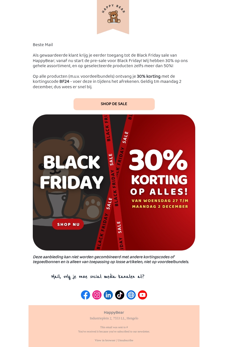 Ontvang exclusieve toegang tot de Black Friday sale van HappyBear! Vanaf nu krijg je 30% korting op het hele assortiment, met zelfs meer dan 50% korting op geselecteerde producten. Gebruik de kortingscode BF24 bij het afrekenen. Deze actie loopt van woensdag 27 november tot en met maandag 2 december. Zorg dat je erbij bent!