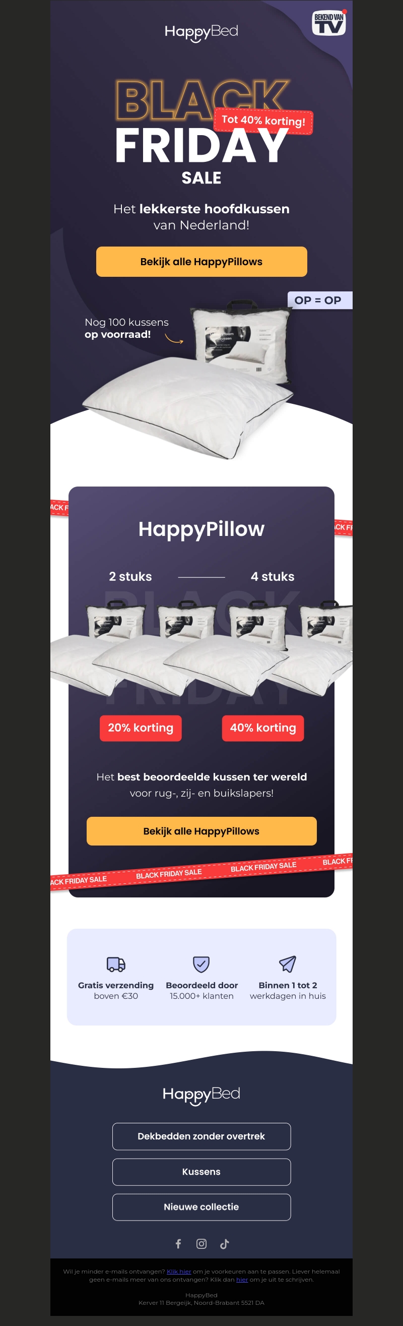 Profiteer van de Black Friday Sale met kortingen tot 40% op HappyPillows. Beperkte voorraad: nog 100 kussens beschikbaar. Kies uit 2 of 4 stuks voor ultieme slaapcomfort. Gratis verzending voor bestellingen boven €50. Beoordeeld door meer dan 15,000 klanten.