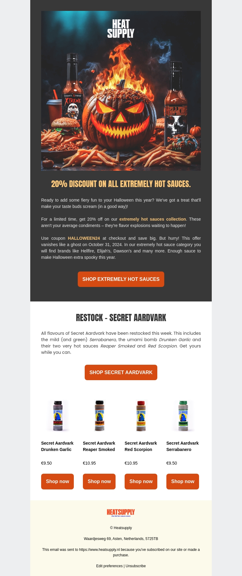 Bereid je voor op een vurige Halloween met 20% korting op onze extreme hete sauzen. Voeg een pittige twist toe aan je feest met merken zoals Hellfire en Dawson's. Gebruik de kortingscode HALLOWEEN24 tot 31 oktober 2024. Mis deze kans niet om je Halloween nog spannender te maken! Bezoek onze website voor meer informatie.
