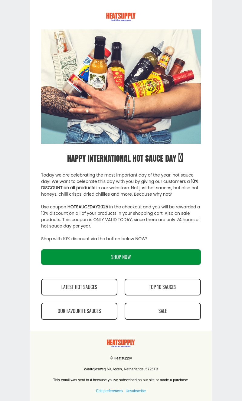 Vandaag vieren we Internationale Hot Sauce Dag met een speciale aanbieding. Ontvang 10% korting op al je aankopen in onze webshop. Deze aanbieding geldt voor alle producten, inclusief hete sauzen, honing, en gedroogde pepers. Gebruik de speciale kortingscode bij het afrekenen. Mis deze kans niet want de actie is alleen vandaag geldig!